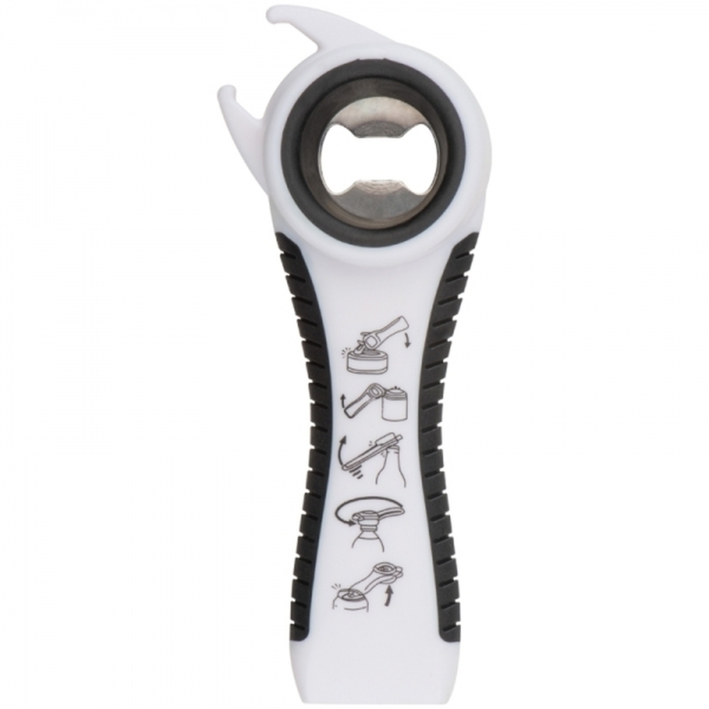Otwieracz wielofunkcyjny umożliwiający otwieranie butelek, puszek i słoików. Dostępny w białym kolorze.