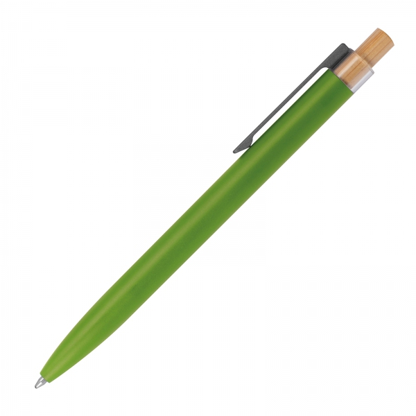 Długopis wykonany z aluminium pochodzącego z recyklingu, z niebieskim wkładem i bambusowym przyciskiem.