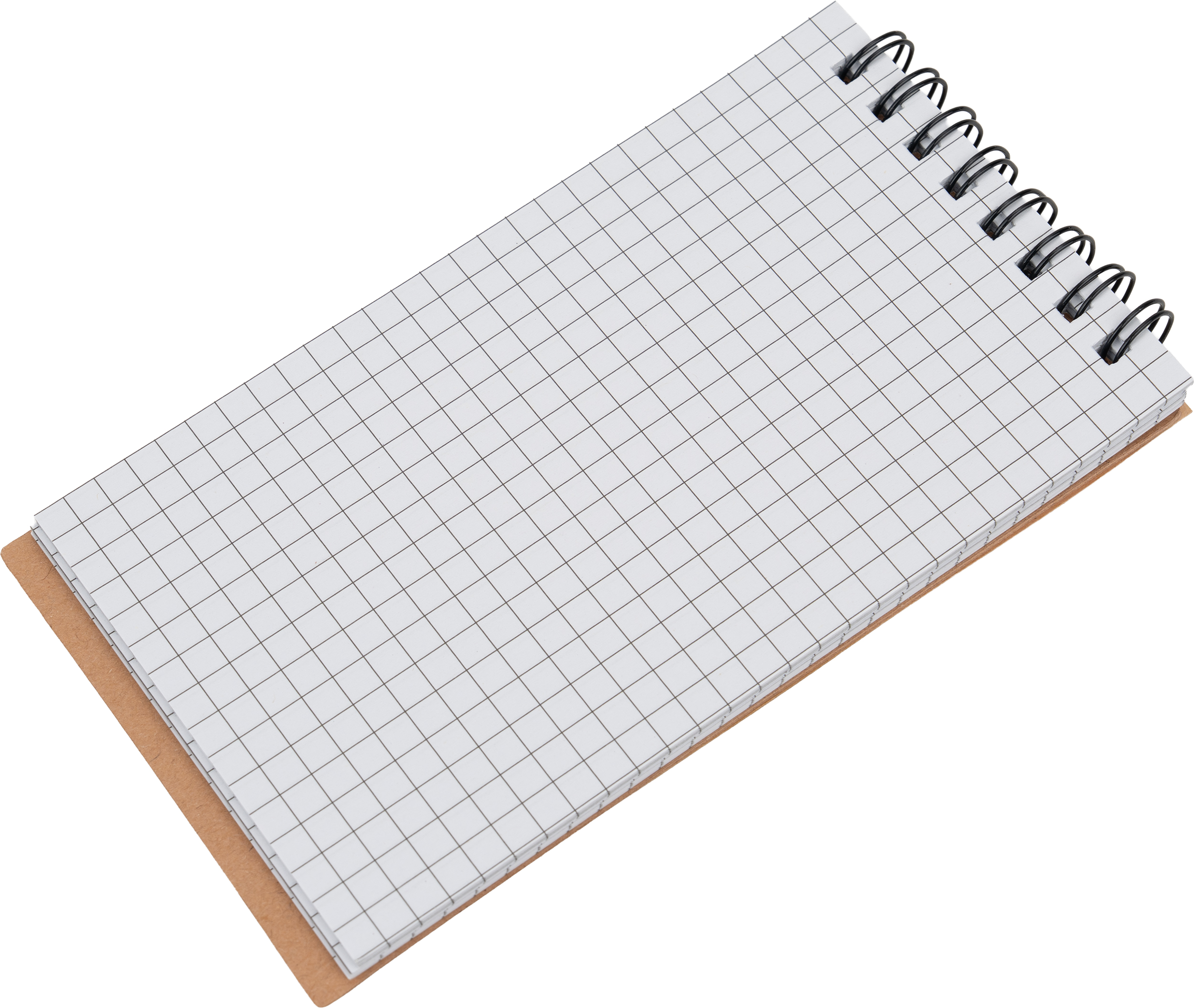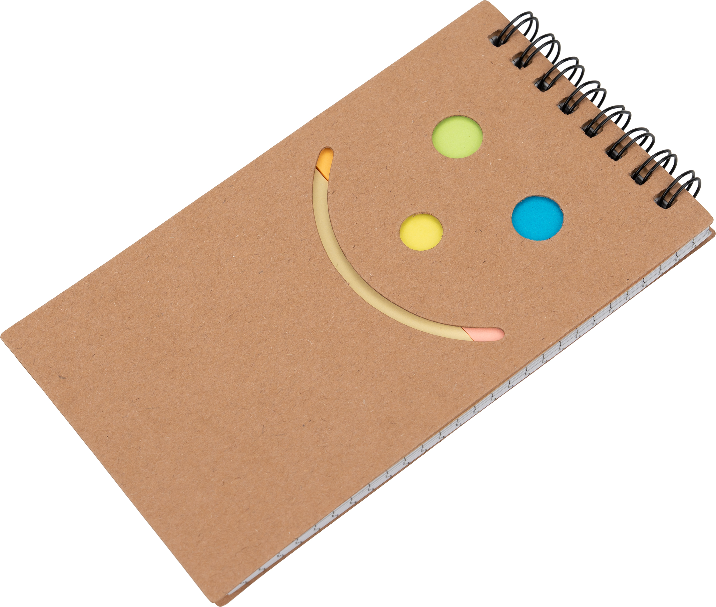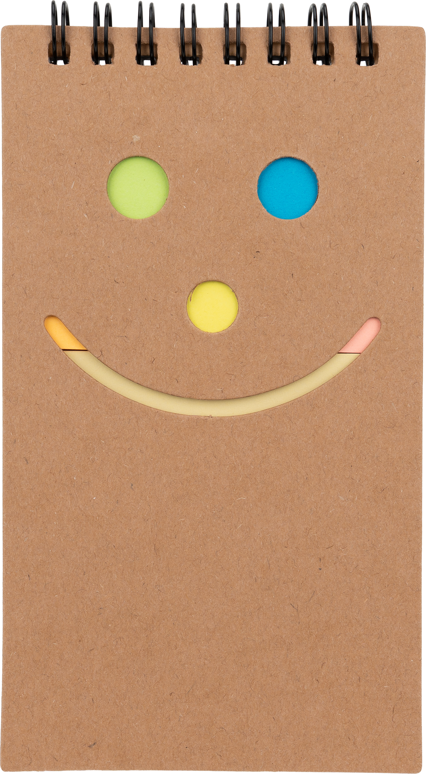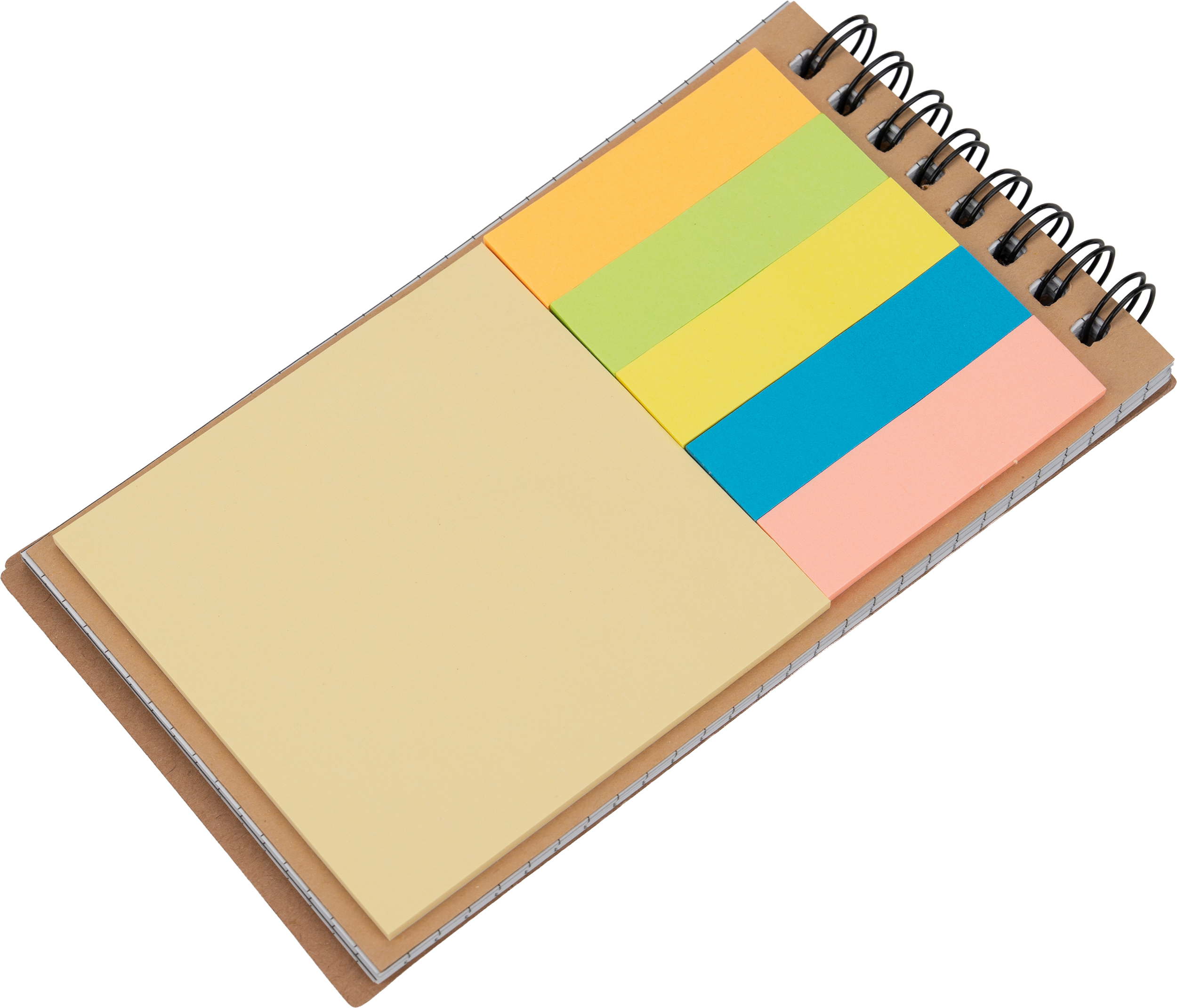Notes na spirali w kartonowej okładce, z 50 karteczkami w kratkę i 5 małymi bloczkami kolorowych karteczek do zaznaczania.