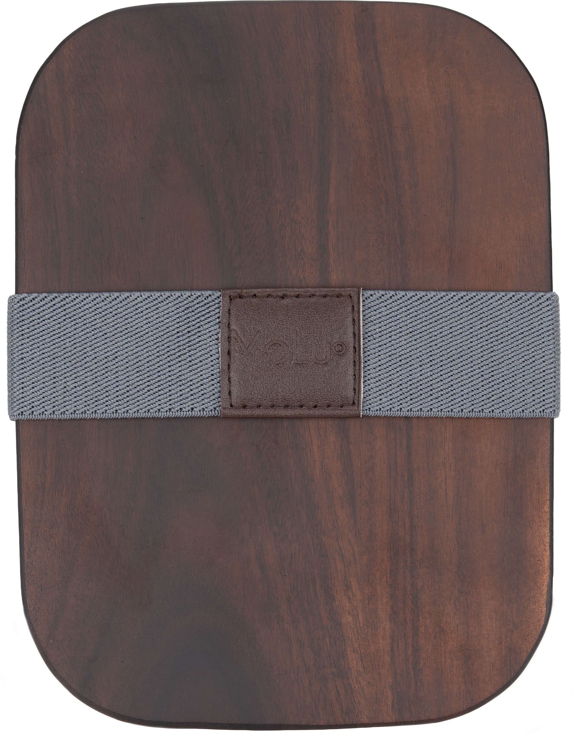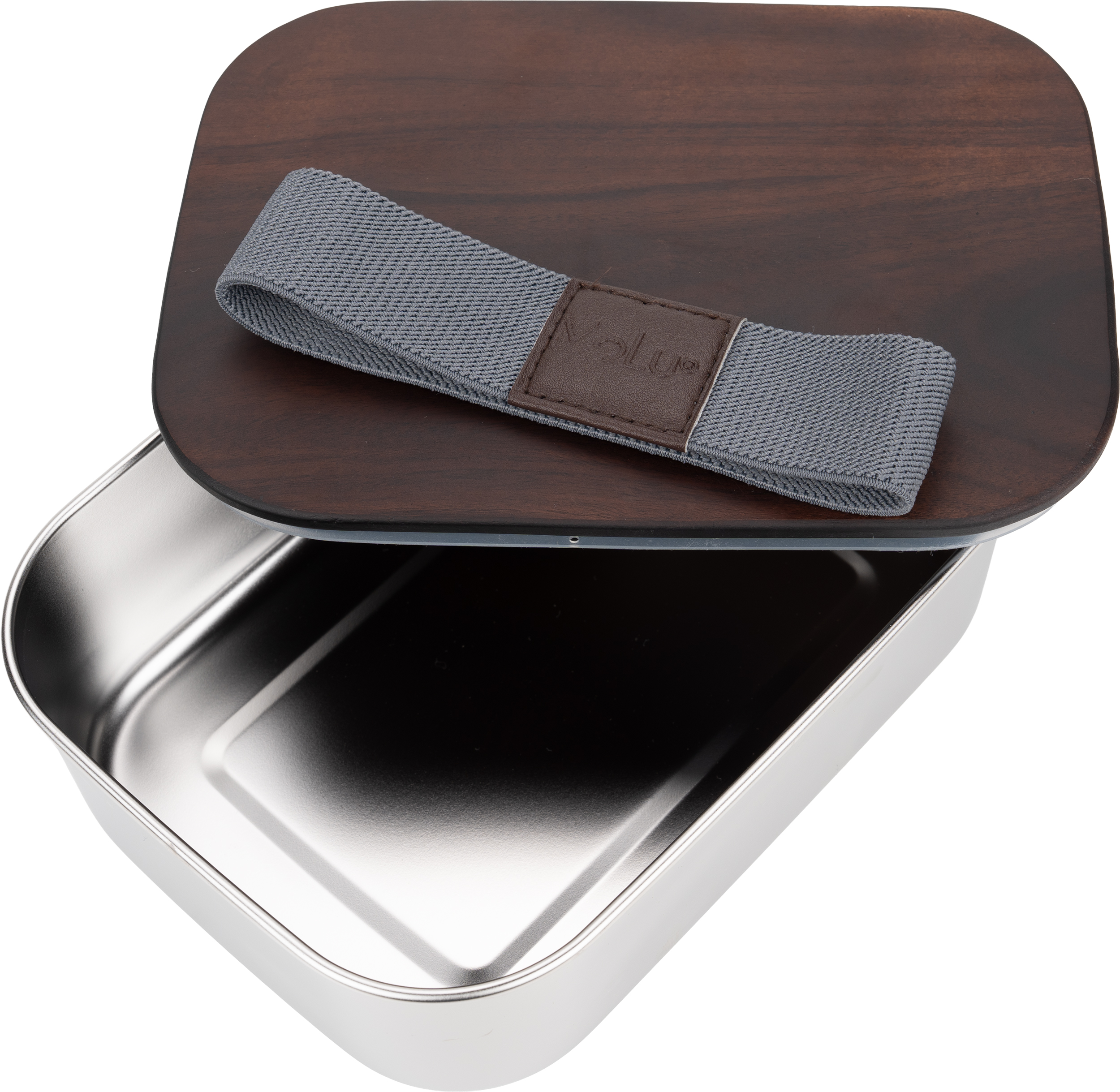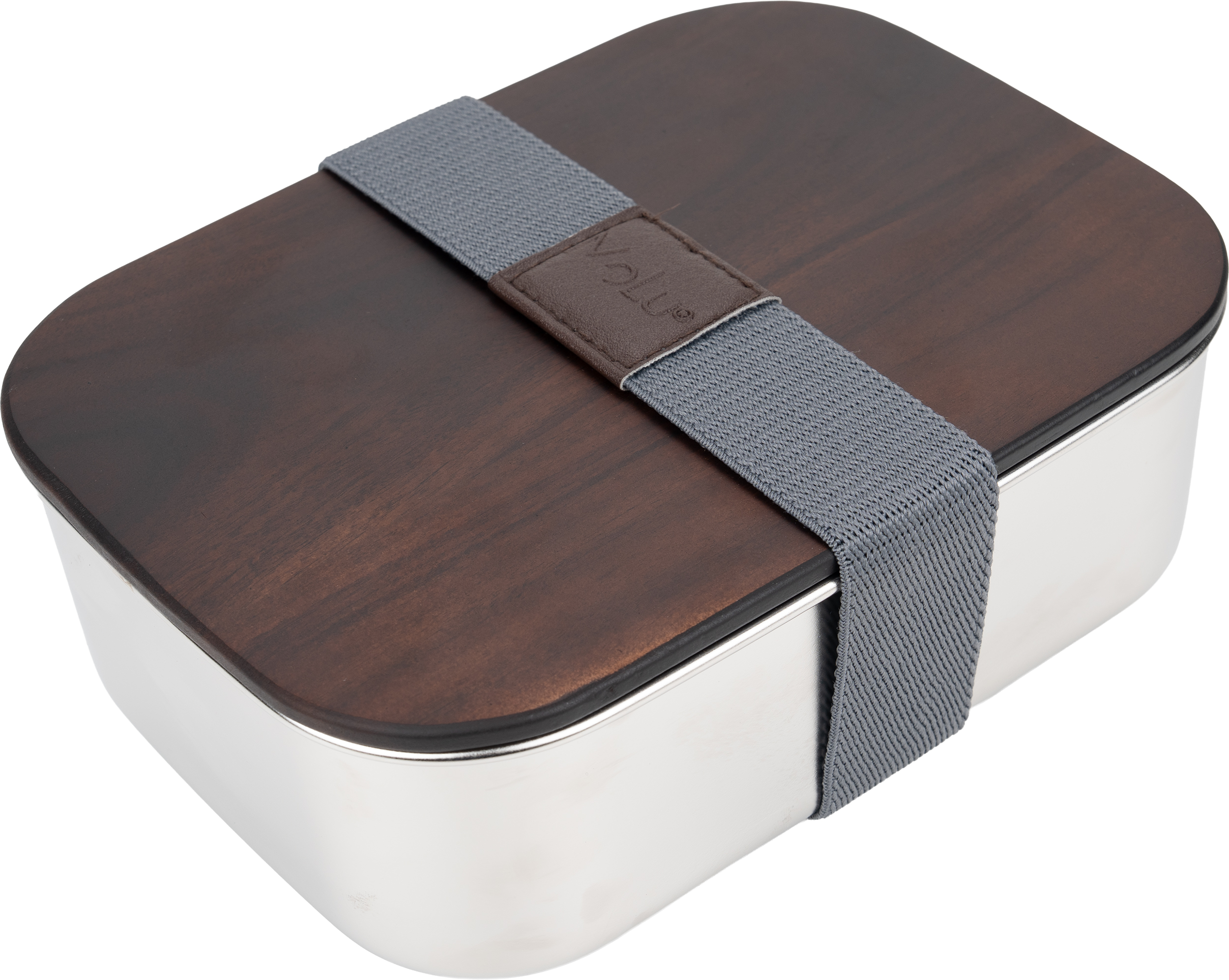 Lunch box wykonany ze stali nierdzewnej z recyklingu, z pokrywką z drewna akacjowego oraz gumką. Pojemność 1000 ml.
