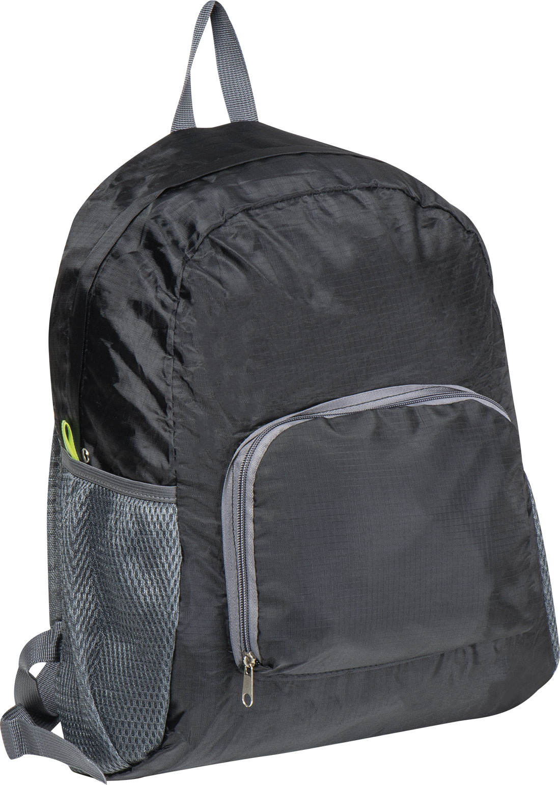Składany plecak z RPET. Plecak posiada komorę główną zamykaną na zamek i dwie boczne siateczkowe kieszonki.