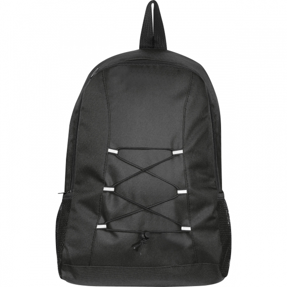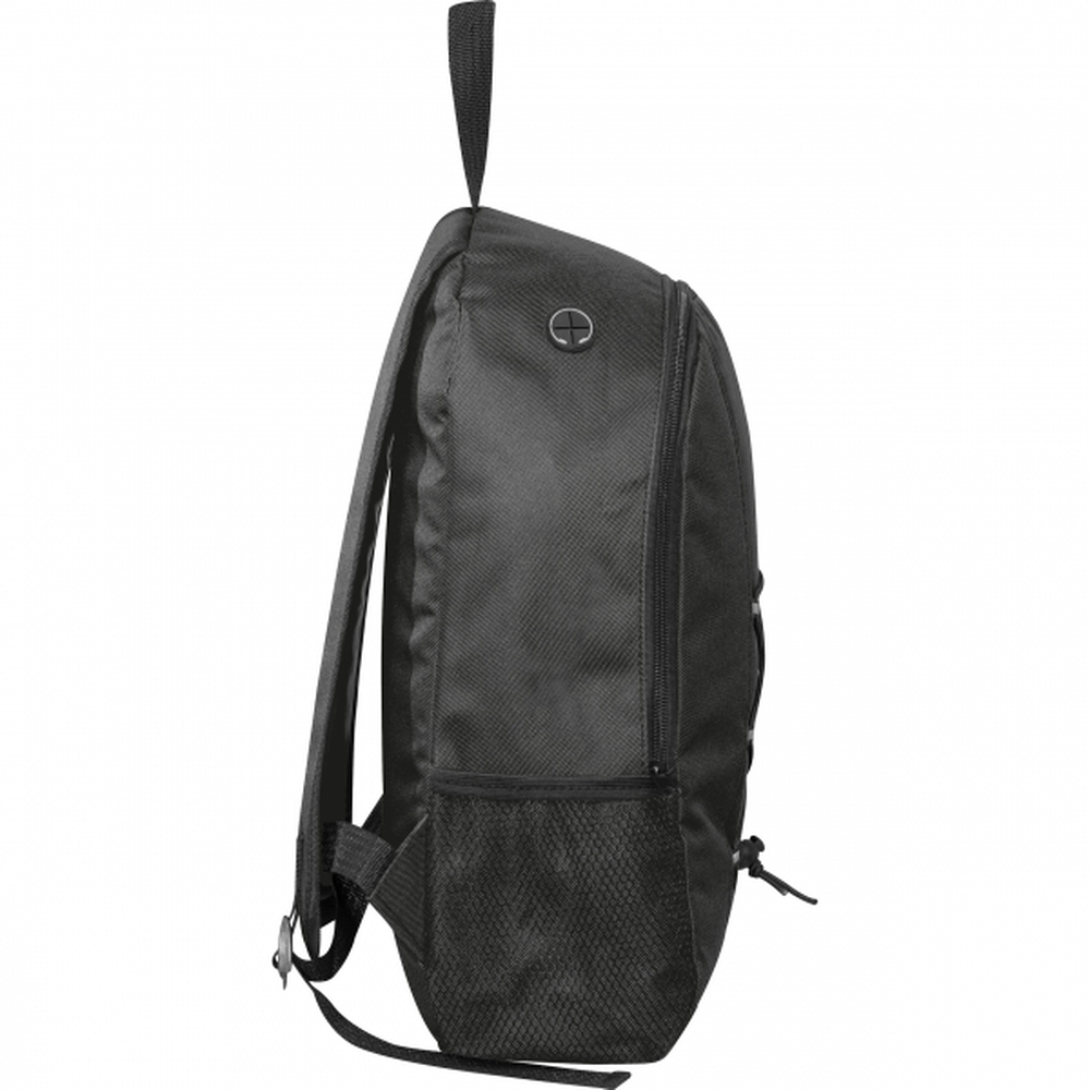 Plecak wykonany z poliestru 600D, pochodzącego z recyklingu. Plecak posiada uchwyt do przenoszenia, dwie siatkowe kieszenie boczne i watowane szelki.