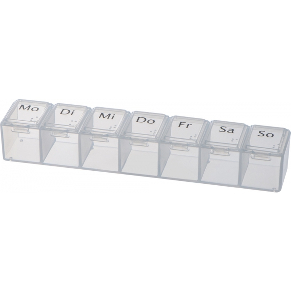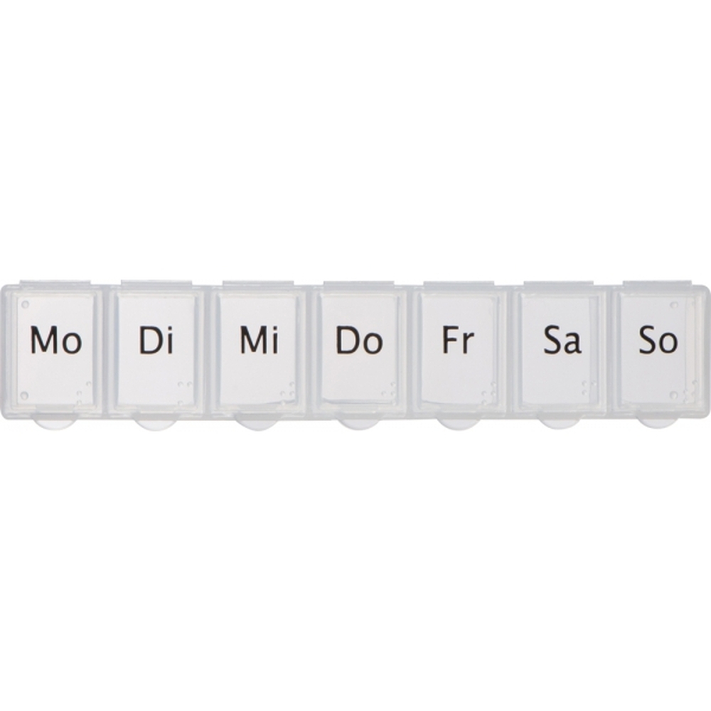 Pudełko na leki z 7 przegródkami na każdy dzień tygodnia. Dni tygodnia podane w języku niemieckim.