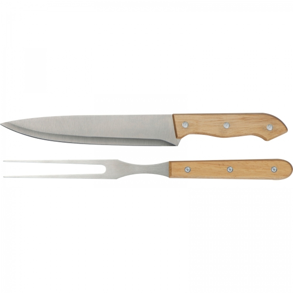 Zestaw sztućców do mięsa, składający się z noża i widelca, wykonane ze stali nierdzewnej z drewnianą rączką. Całość zapakowana w tekturowe opakowanie.