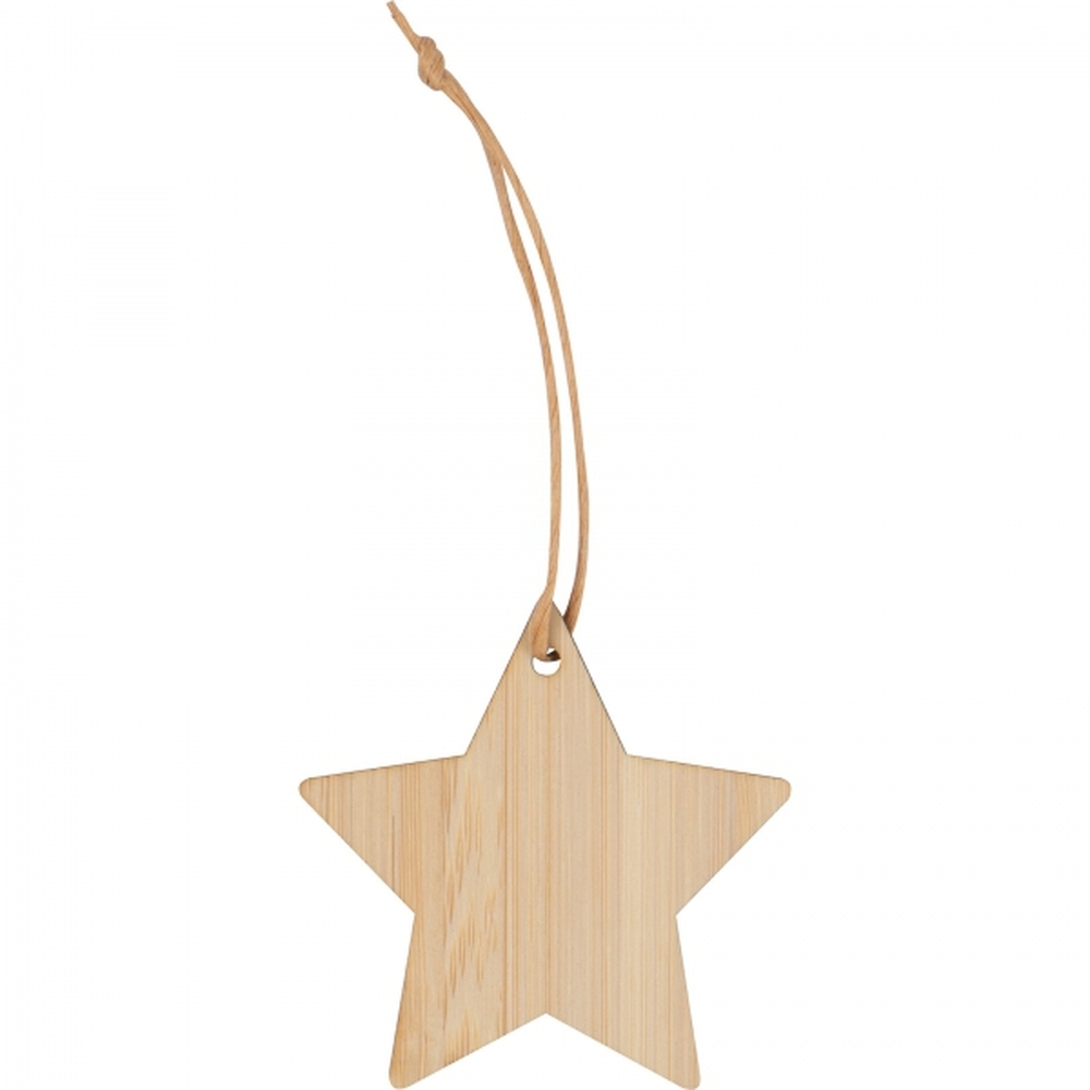 Drewniana zawieszka na choinkę w kształcie gwiazdki.