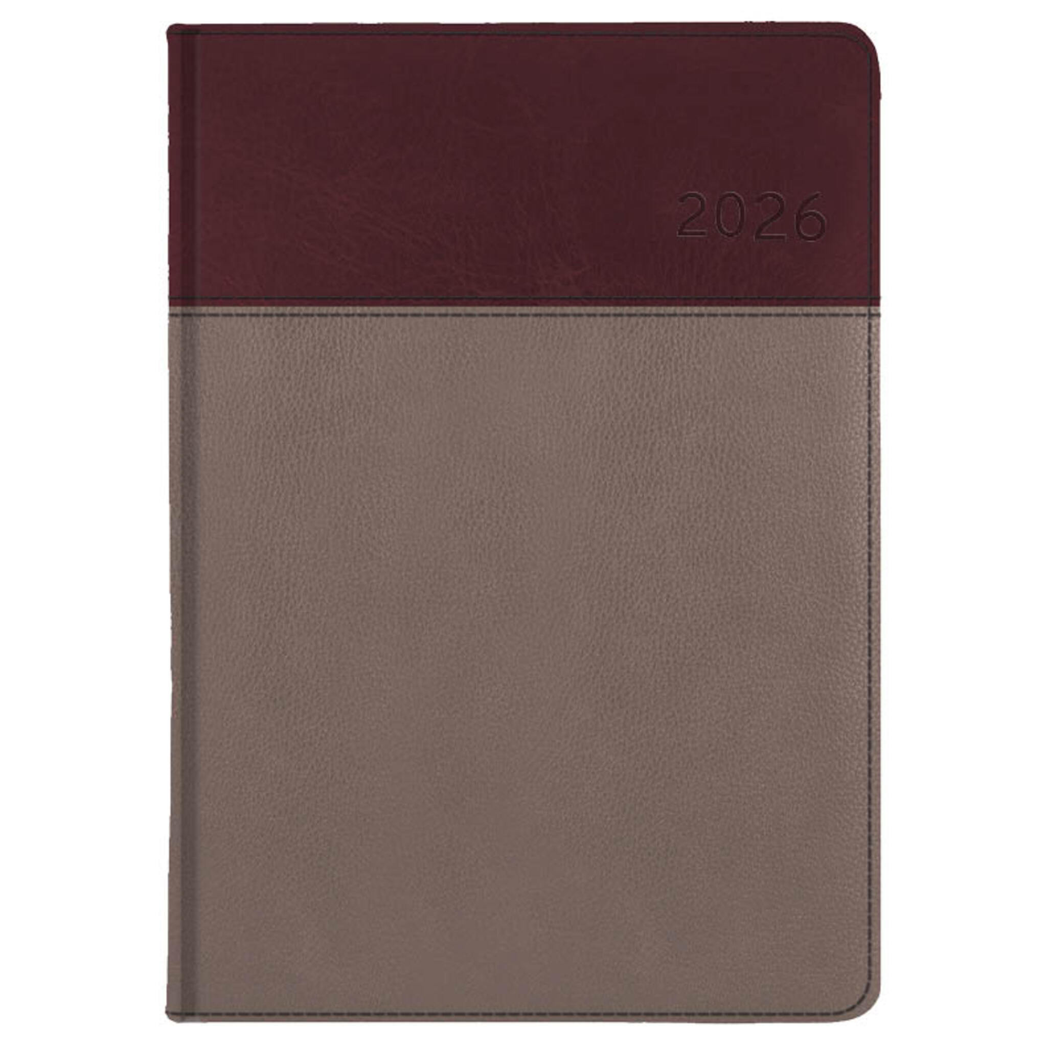 Terminarz w układzie dziennym, drukowany na papierze kremowym. Kolor druku szary i bordowy Blok terminarza szyty nićmi, z kapitałką i tasiemką w kolorze białym oraz perforowanymi narożnikami. Narożniki terminarza zaokrąglone.