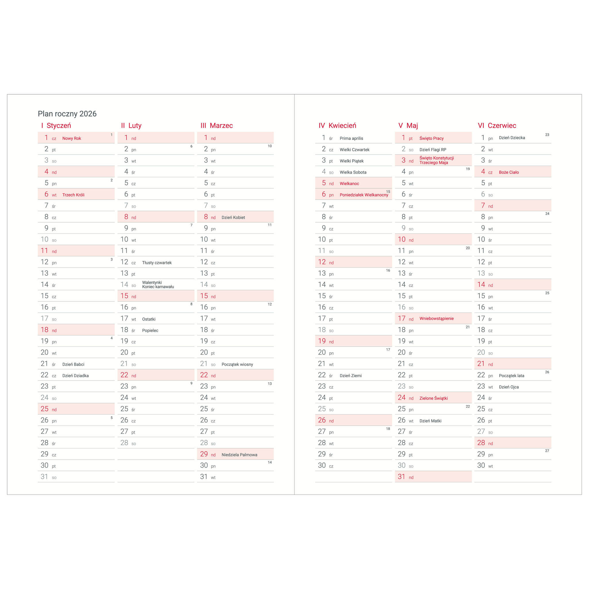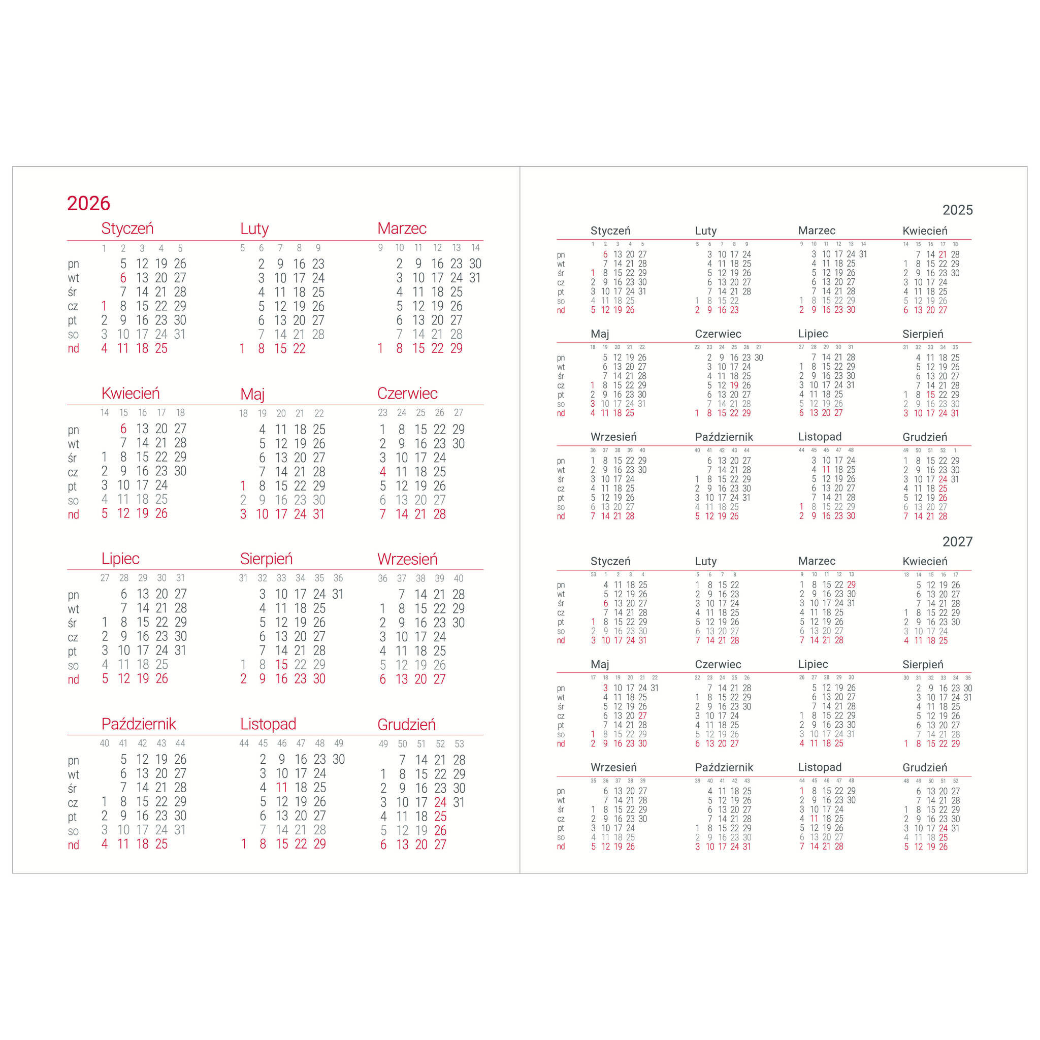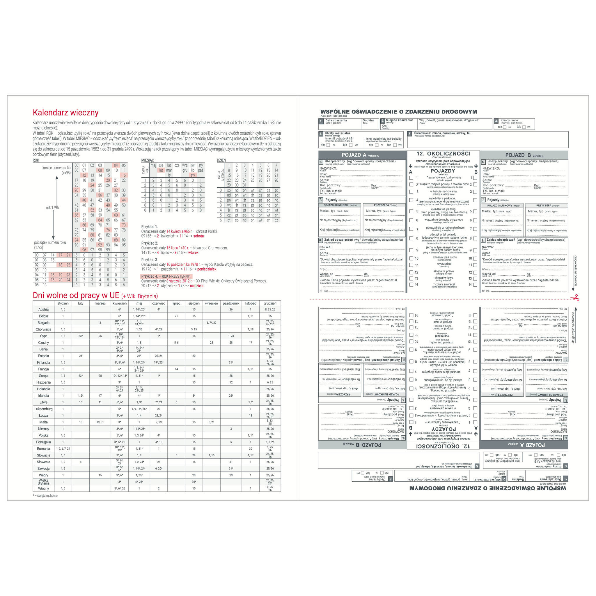 • plan roku • wschody i zachody Słońca, fazy Księżyca • kalendarium 2025,2026 i 2027 • plan każdego miesiąca • wieczny kalendarz • plan urlopowy • dni wolne w UE + UK • wspólne oświadczenie o zdarzeniu drogowym • zasady pierwszej pomocy przedmedycznej • zasady selektywnej zbiórki odpadów • układ SI • alfabetyczny skorowidz teleadresowy • barwne mapy
