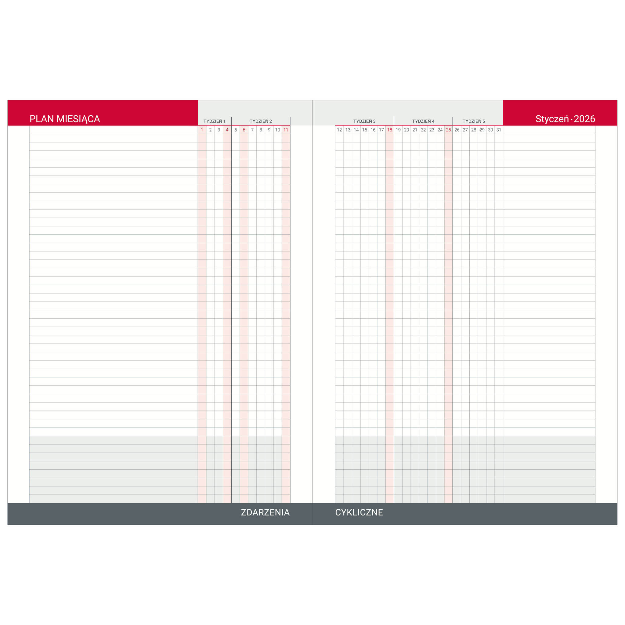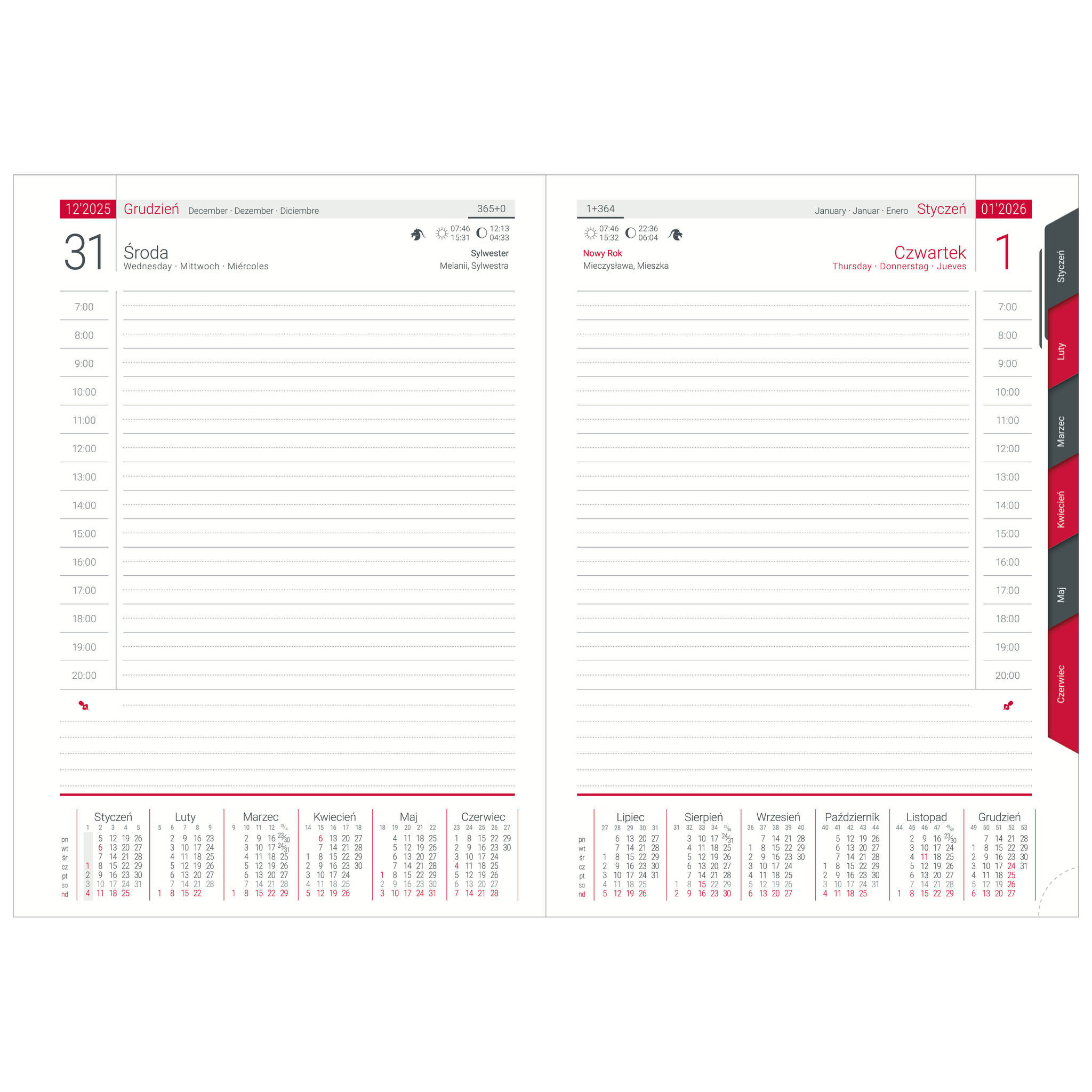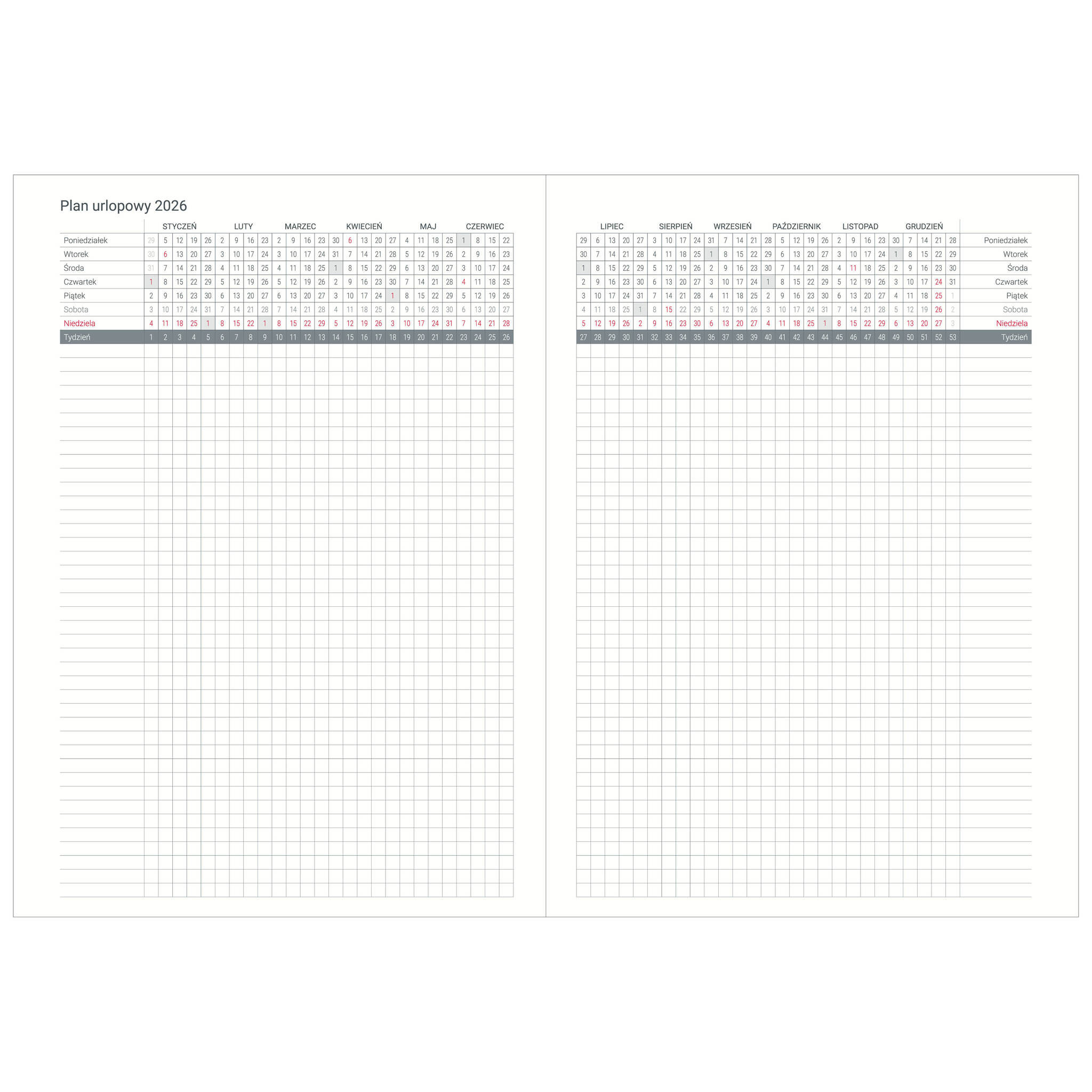 Terminarz książkowy formatu B5 (171 x 240 mm), objętość 368 stron. Język: PL/EN/DE/ES.