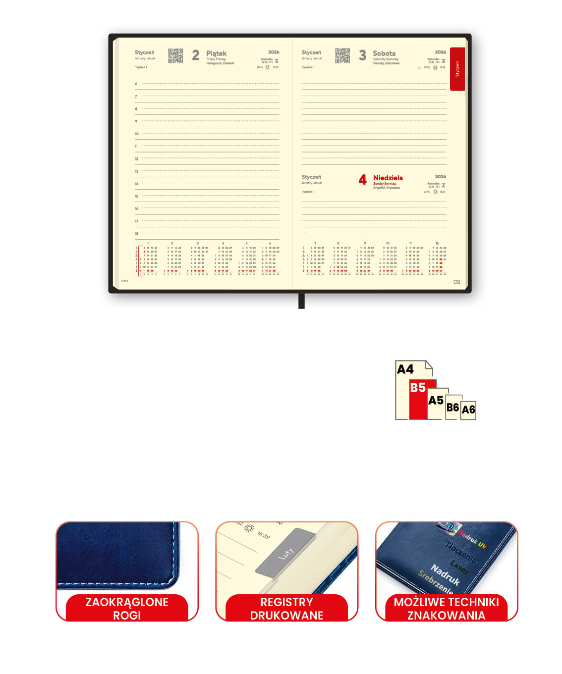 UWAGA! Kolor uzyskany w procenie znakowania laserowego kalendarzy może różnić się nawet w ramach okleiny o tej samej kolorystyce.