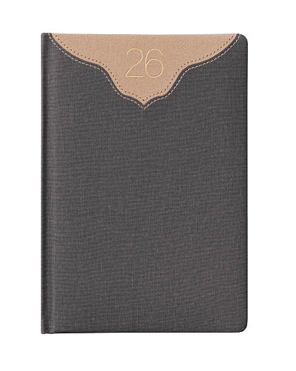 Oprawy kalendarzy wykonane z artystycznym łączeniem kontrastujących materiałów. Kalendarz posiada: skrócone 3-letnie kalendarium, planer roczny, kalendarium dzienne (PL,GB,D) z układem skróconego rocznego, stronę na notatki, mapę Polski, bloki szyte nićmi, dwa kolory druku (szary-burgund), wstążkę w kolorze okleiny.