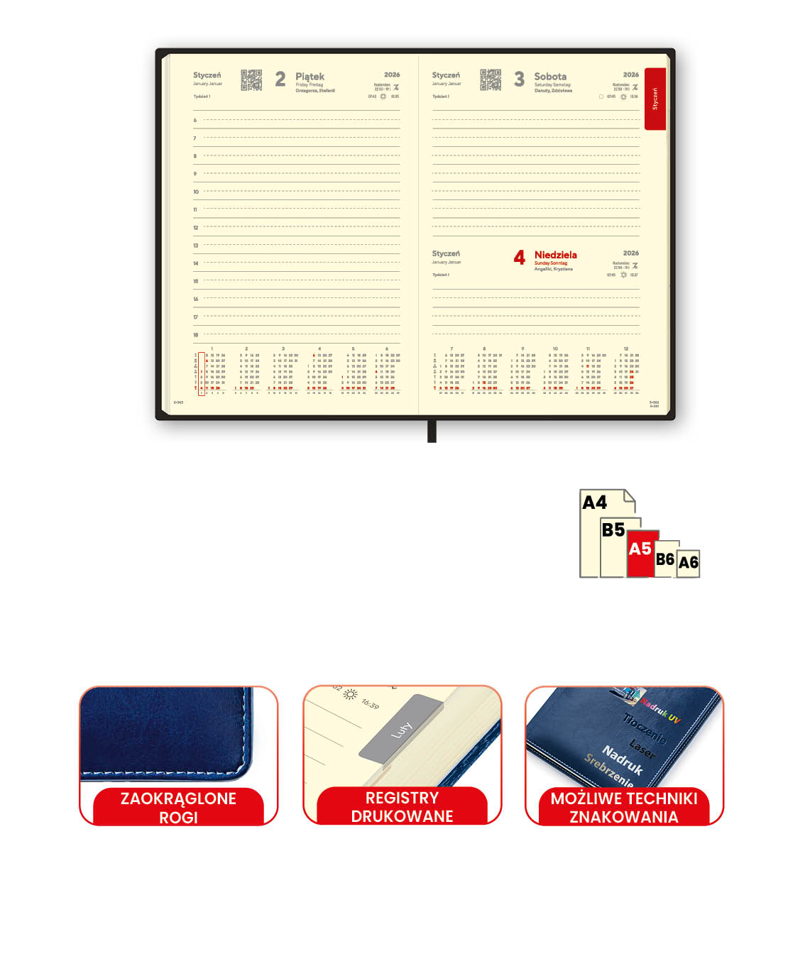Oprawy kalendarzy wykonane z artystycznym łączeniem kontrastujących materiałów. Kalendarz posiada: skrócone 3-letnie kalendarium, planer roczny, kalendarium dzienne (PL,GB,D) z układem skróconego rocznego, stronę na notatki, mapę Polski, bloki szyte nićmi, dwa kolory druku (szary-burgund), wstążkę w kolorze okleiny.