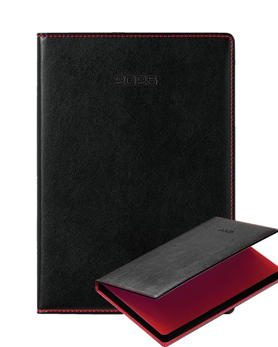 Kalendarz posiada: skrócone 3-letnie kalendarium, planer roczny, kalendarium dzienne (PL,GB,D) z układem skróconego rocznego, stronę na notatki, mapę Polski, bloki szyte nićmi, dwa kolory druku (szary-burgund), kontrastową wstążkę.