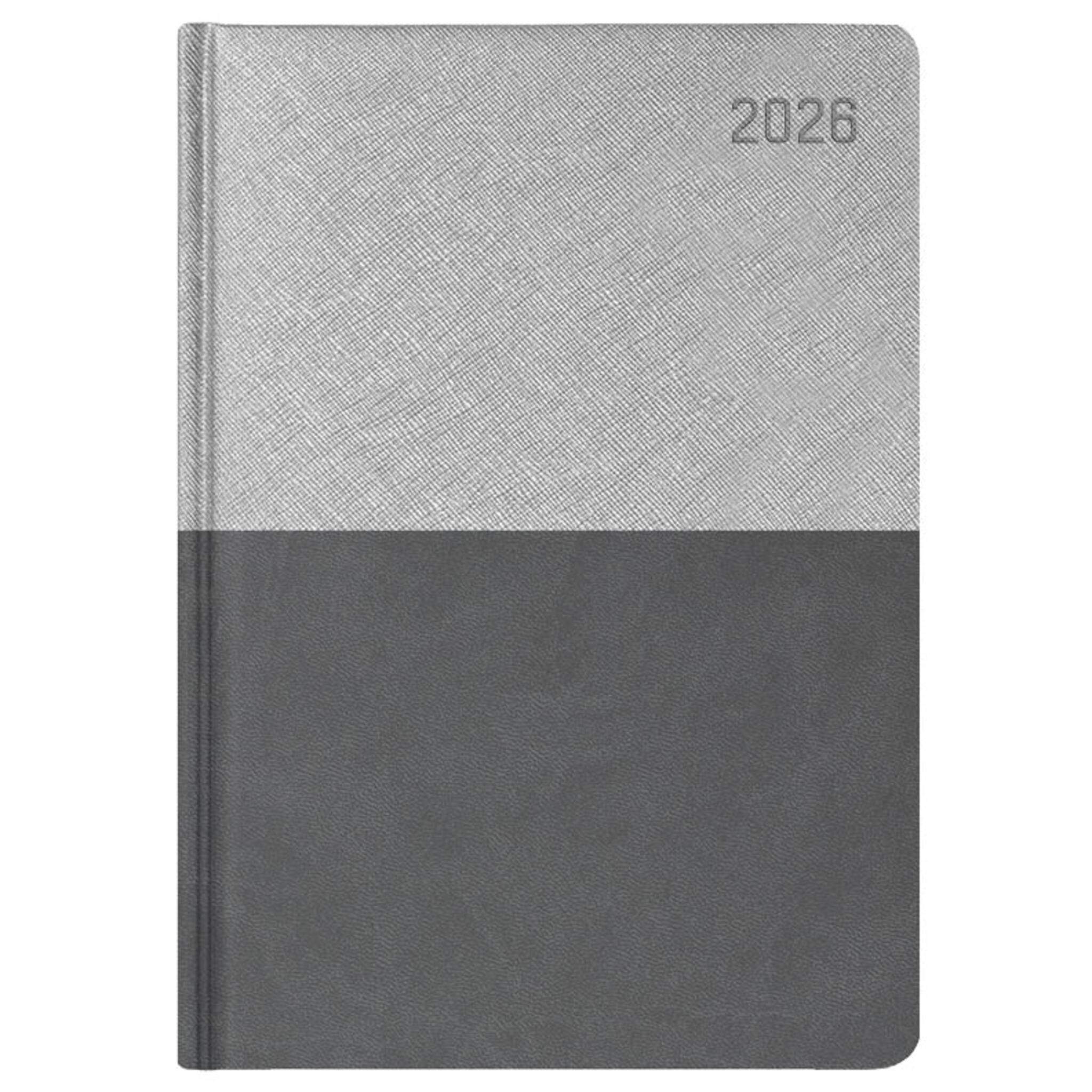 Terminarz w układzie tygodniowym, drukowany na białym papierze. Kolor druku szary. Blok terminarza szyty nićmi, z kapitałką i tasiemką w kolorze szarym oraz perforowanymi narożnikami. Narożniki terminarza zaokrąglone. Registry drukowane.