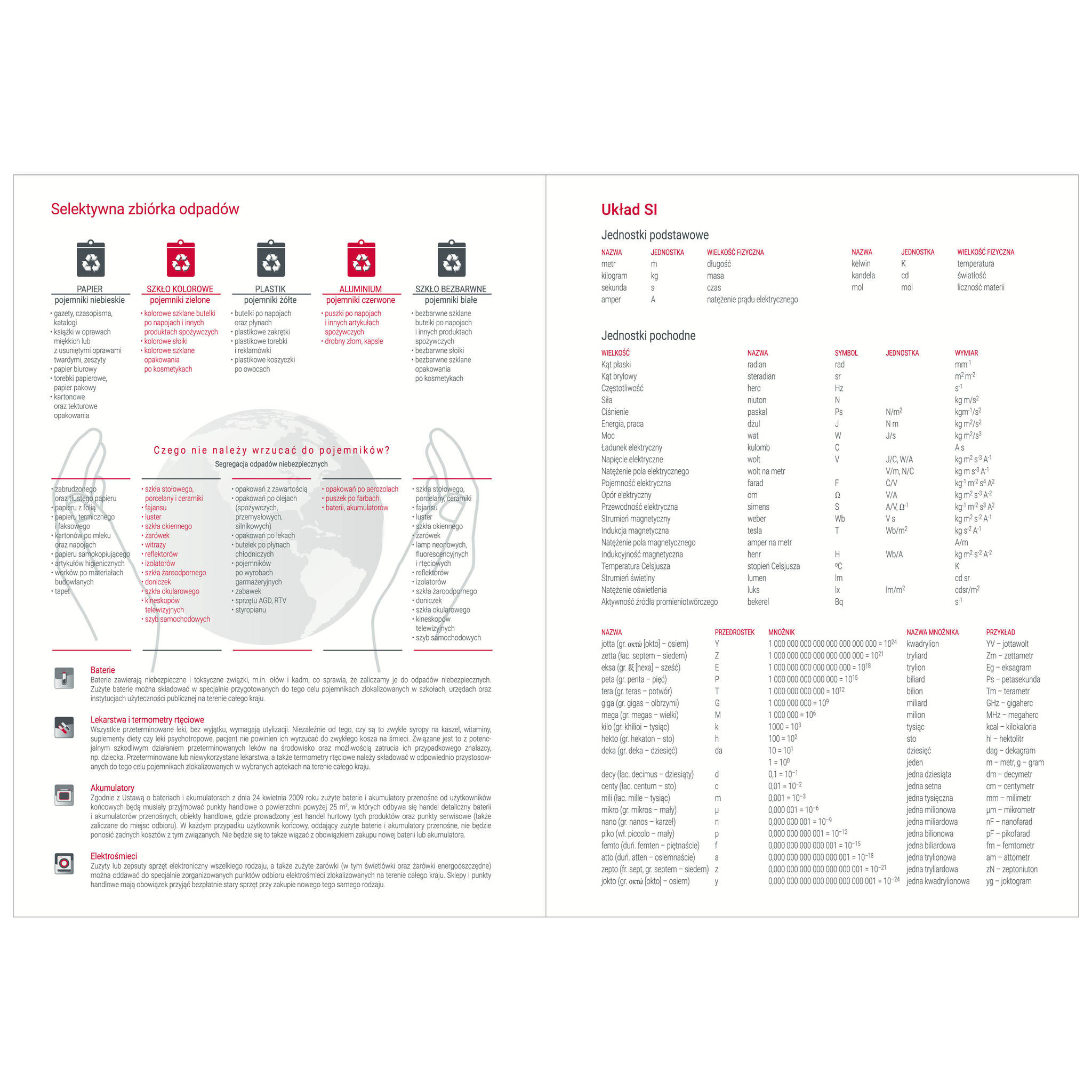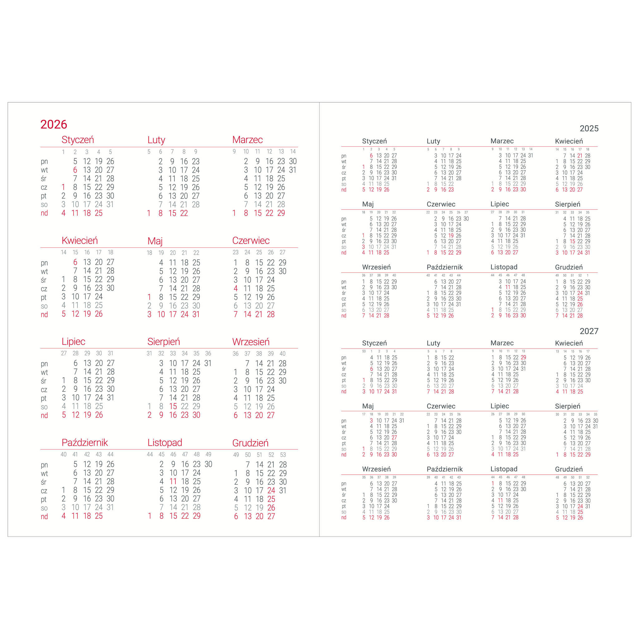 • plan roku • wschody i zachody Słońca, fazy Księżyca • plan urlopowy • wieczny kalendarz • plan każdego miesiąca • informacje dla kierowców • wspólne oświadczenie o zdarzeniu drogowym • zasady pierwszej pomocy przedmedycznej • zasady selektywnej zbiórki odpadów • barwne mapy • kalendarium 2025, 2026 i 2027 • alfabetyczny skorowidz teleadresowy
