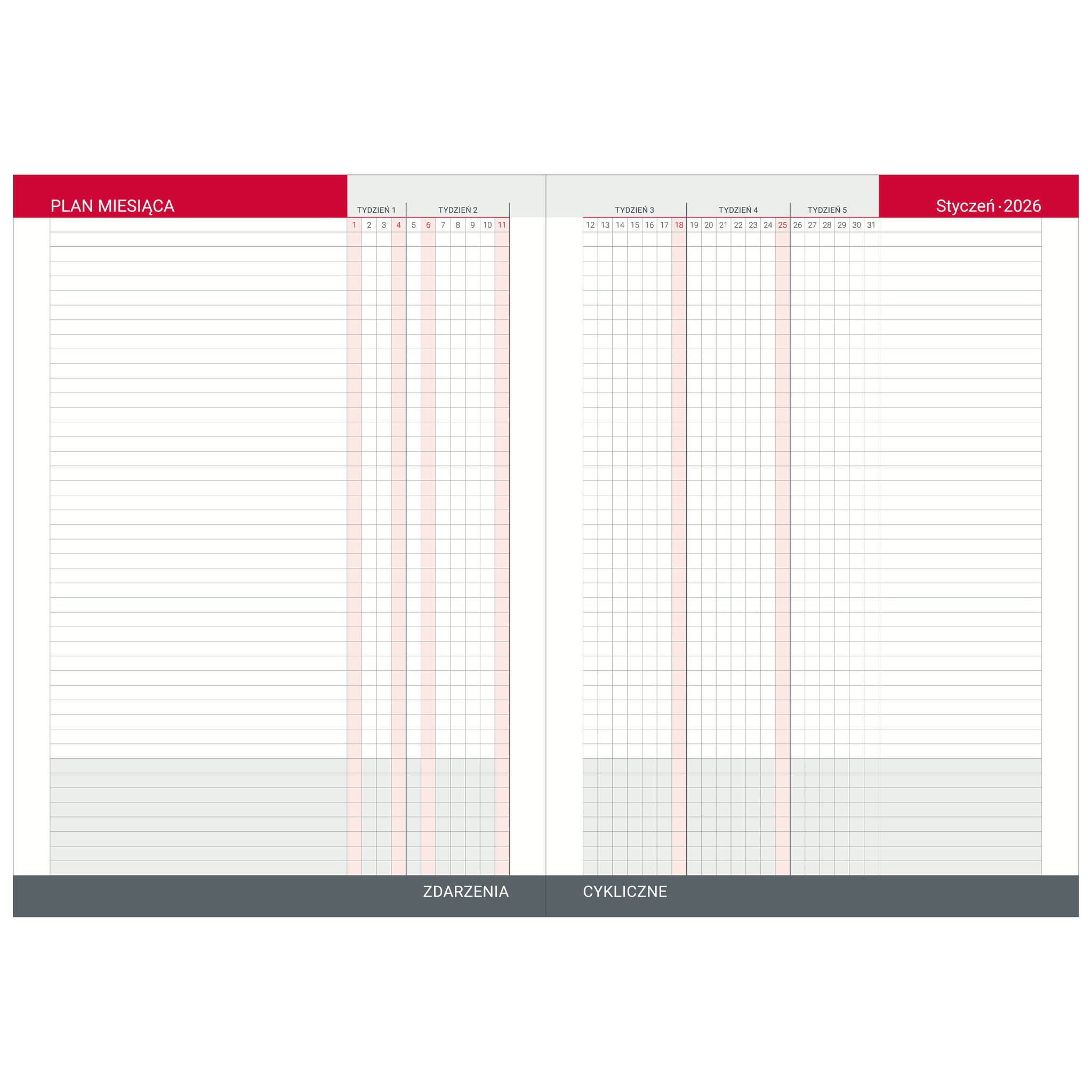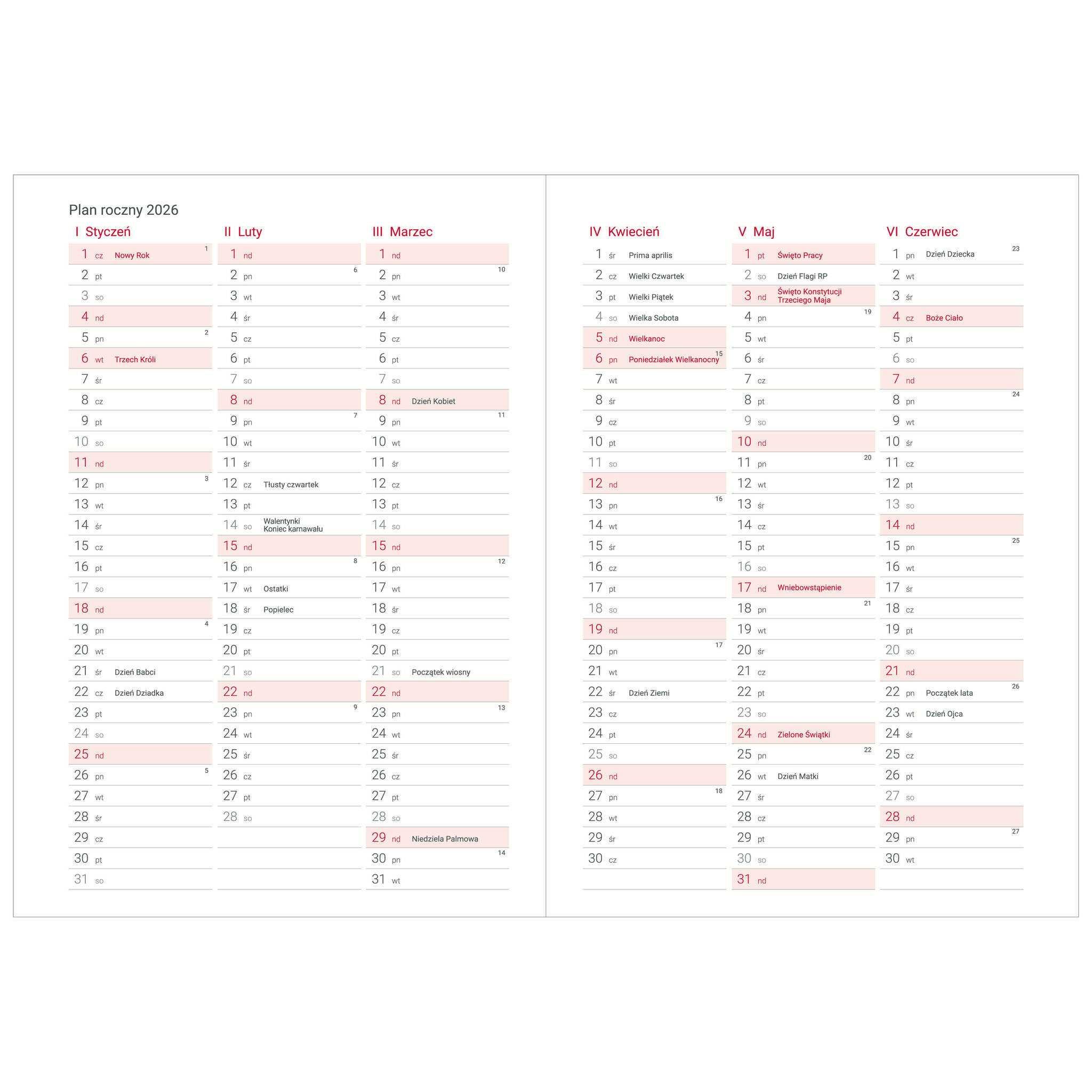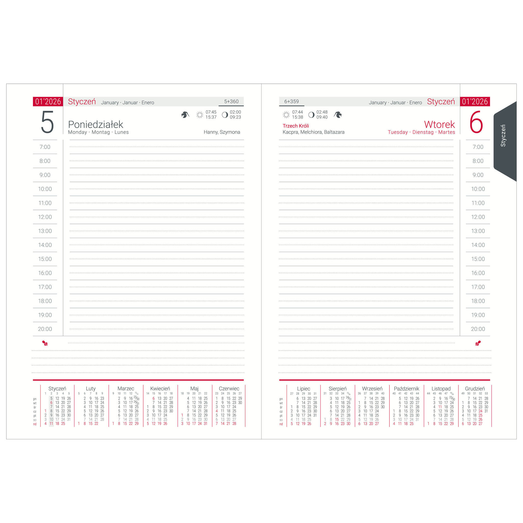 Terminarz książkowy formatu A5 (144 x 203 mm).