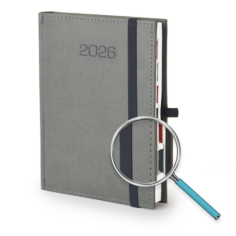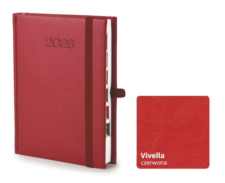Kalendarz A5, książkowy z wyciętymi registrami kciukowymi, elastyczna gumka zamykająca kalendarz oraz uchwyt na długopis w kolorze oprawy