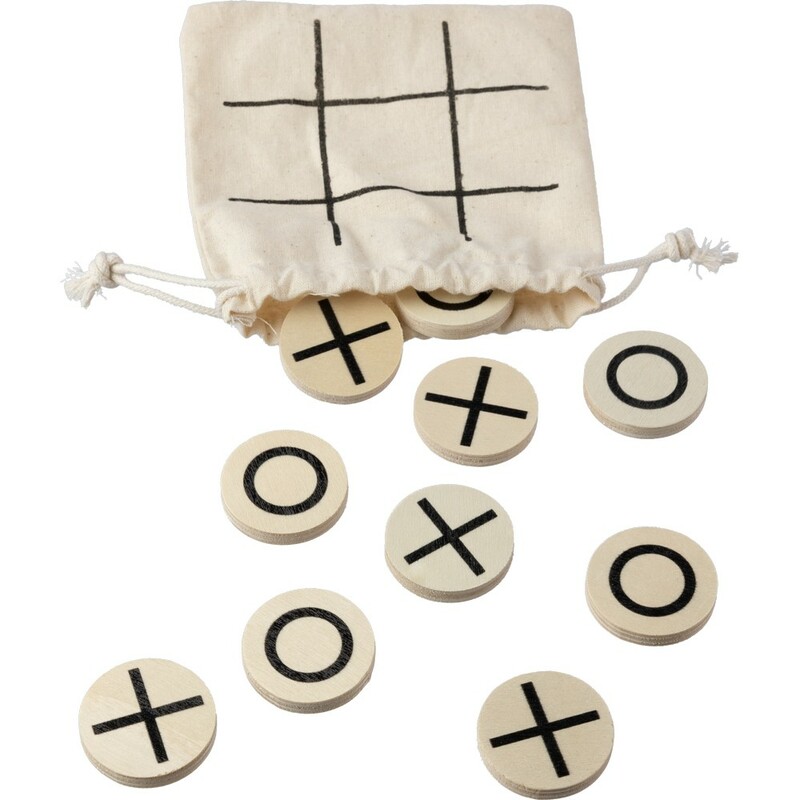 Gra "kółko i krzyżyk", zawiera 10 małych drewnianych żetonów zapakowanych w bawełniany woreczek, produkt wykonany z drewna